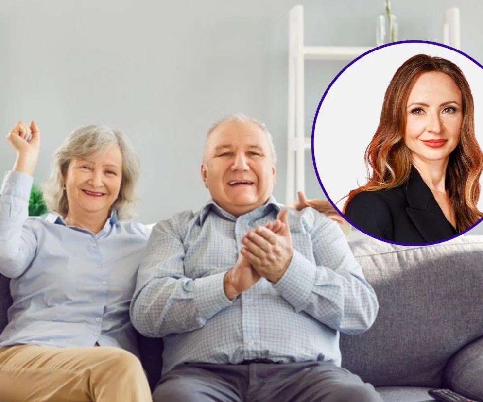 Autor: Shutterstock / Studio Romantic / MPRiPS Uśmiechnięta para seniorów na kanapie, z kobietą z zaciśniętą pięścią w geście radości i mężczyzną klaszczącym, symbolizująca nadzieję na wcześniejszą emeryturę. W prawym górnym rogu Agnieszka Dziemianowicz-Bąk. Więcej o zmianach w emeryturach stażowych przeczytasz na Super Biznes.